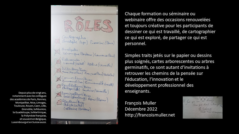 Chaque formation ou séminaire ou webinaire offre des occasions renouvelées et toujours créatives pour les participants de dessiner ce qui est travaillé, de cartographier ce qui est exploré, de partager ce qui est personnel. Depuis plus de 30 ans.